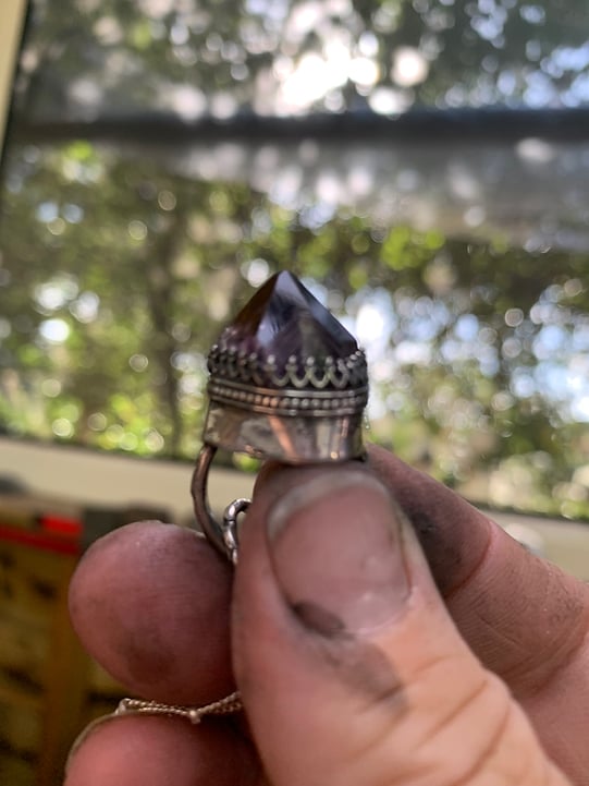 Each piece is hand forged and genuinely bespoke. I pride myself on working in an ethical and environmental studio. All my metal is 100% recycled.Most of the stones are from our travels and polished here at the farm.I hope that when my customers purchase my jewellery they can feel that it was created with respect for the earth.I am a practising Wiccan. My studio is like my temple. I feel jewellery holds its own soul and I hope that my pieces uplift and inspire the wearer.I often add powerful words or affirmations to my work. Symbols and talismans. I hope to bring powerful energy and vibrations to the wearer.Jewellery becomes a sacred personal adornment. Taking the original piece to a higher level of inspiration, self-expression and comfort